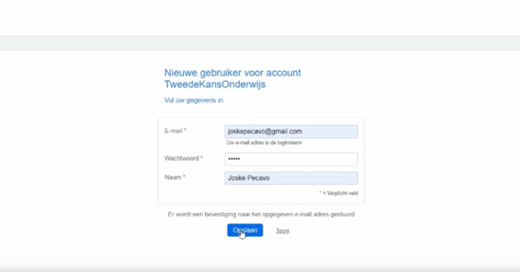 Nieuwe gebruiker aanmaken Voltooid 20% Vul hier je eigen e-mail adres in en verzin een wachtwoord dat je zeker kan onthouden. Dit hoeft geen bestaand wachtwoord te zijn. Vorige Volgende Uitleg via een filmpje Schrijf je hier in voor je module-evaluatie (uitleg overslaan)